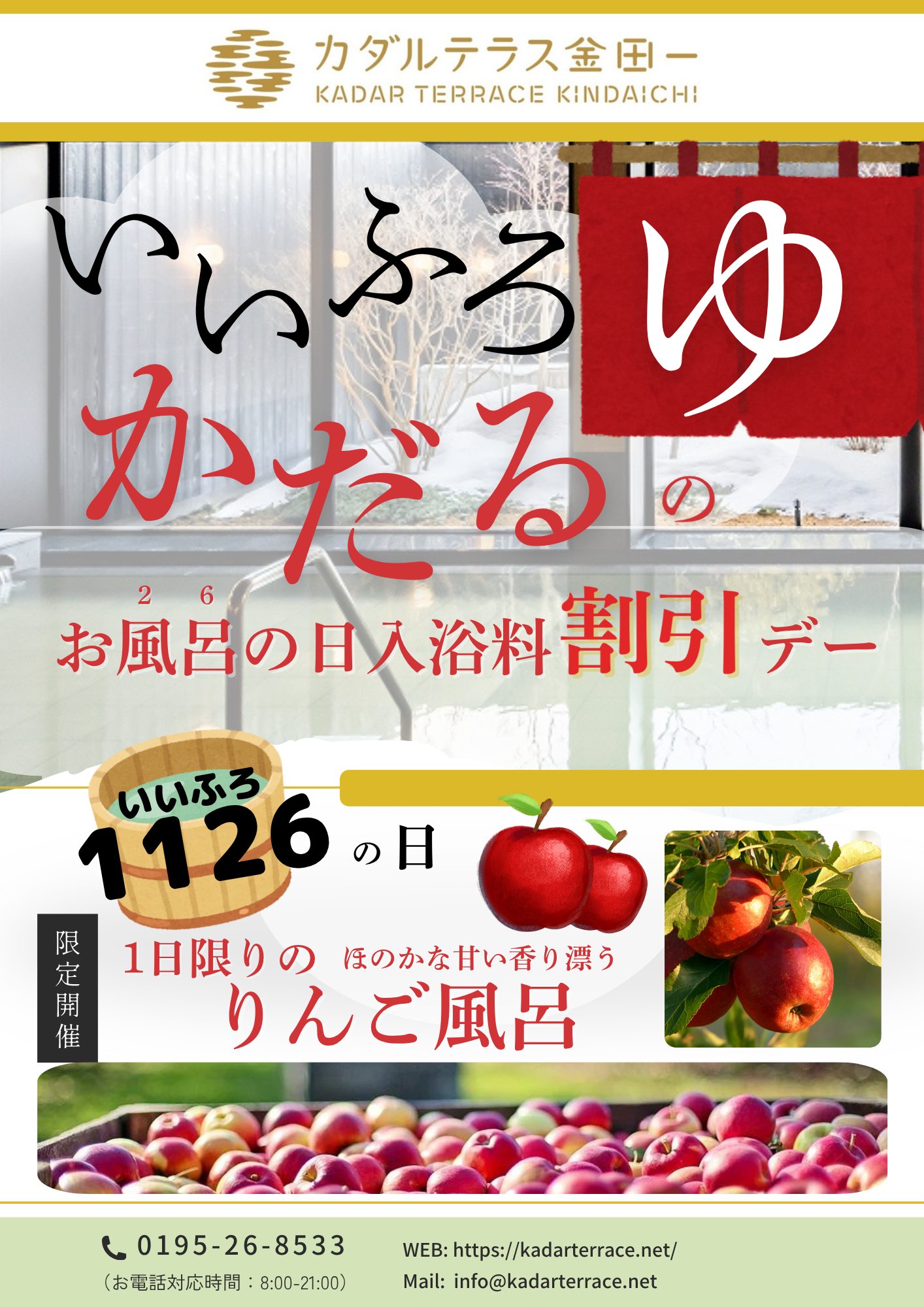 2025/11/10 (Mon) Warning: Invalid argument supplied for foreach() in /home/kadarmirai/kadarterrace.net/public_html/sys/wp-content/themes/template/single-event.php on line 17 11月26日【いいふろの日】 日付: 2025年11月26日