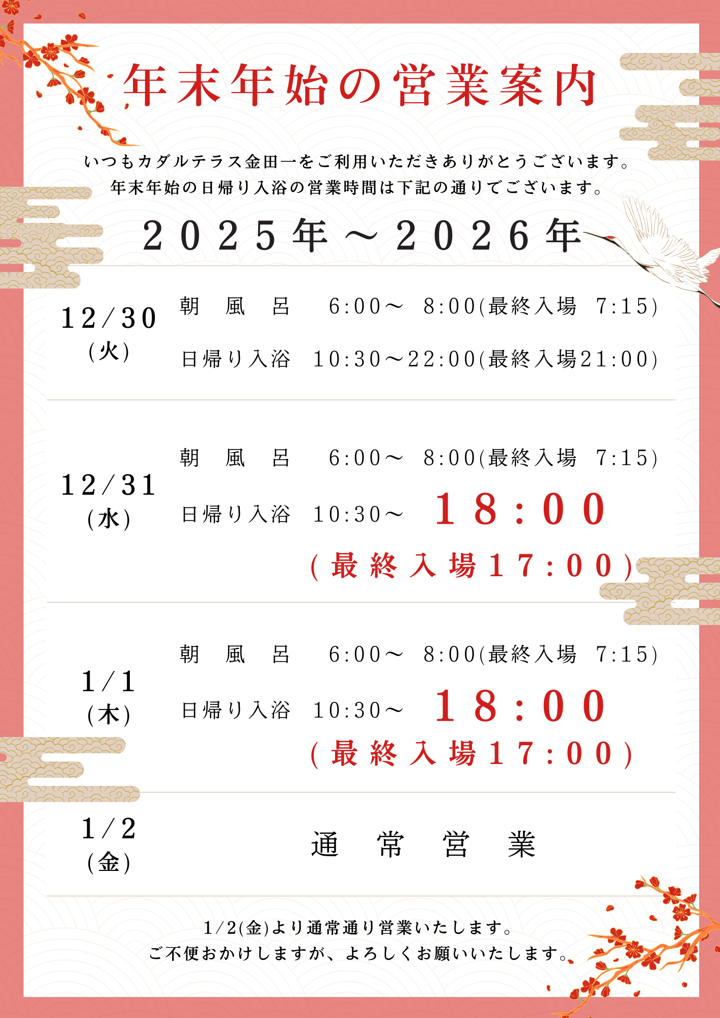 【年末年始 日帰り入浴営業時間のお知らせ】