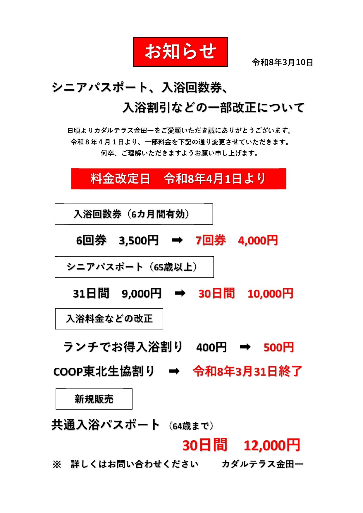 【お知らせ】入浴料金、割引の一部改訂について