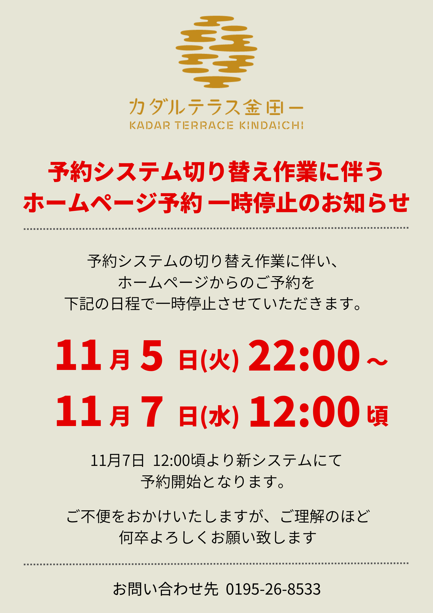 下記の期間、予約システム切り替え作業に伴い、ホームページからのご予約を一時停止いたします。