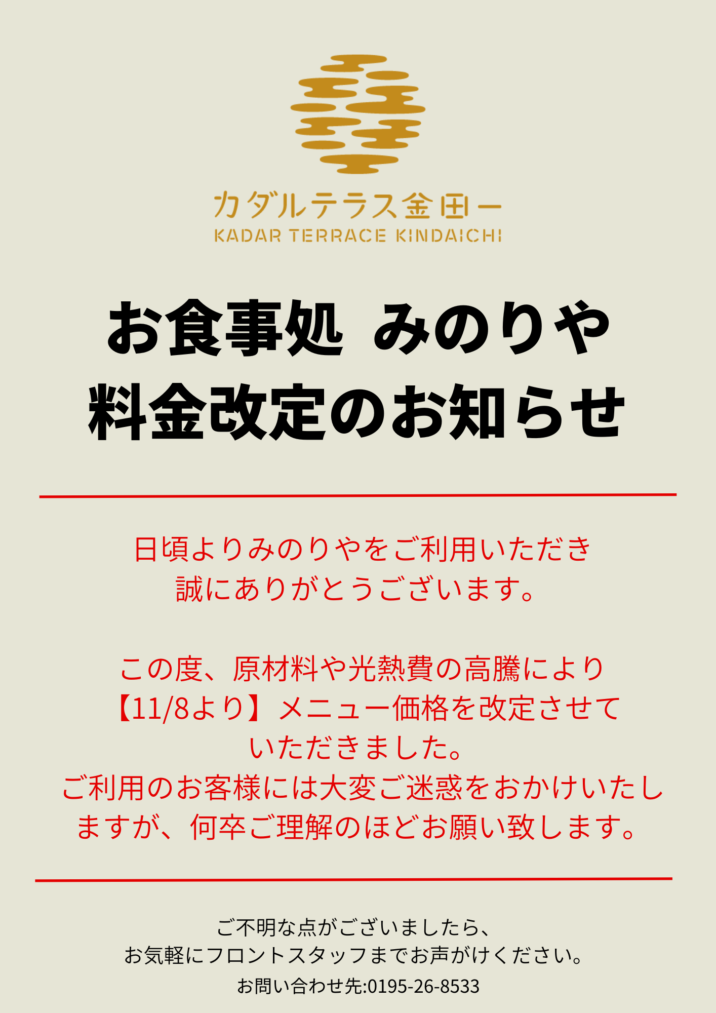 【お食事処 みのりや】 料金改定のお知らせ